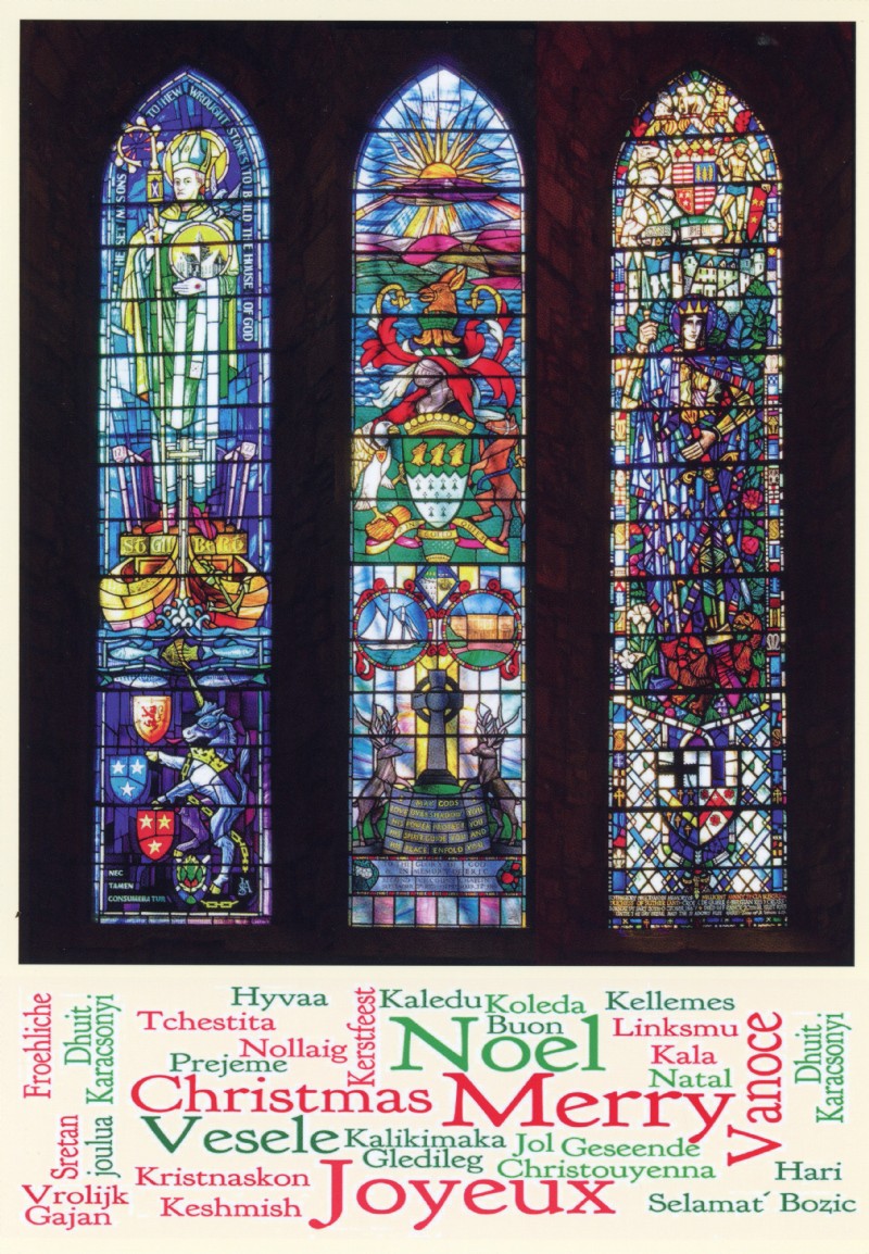 The image is taken from a photograph of stained glass windows in Dornoch Cathedral by Andy Kirby of East Sutherland Camera Club.