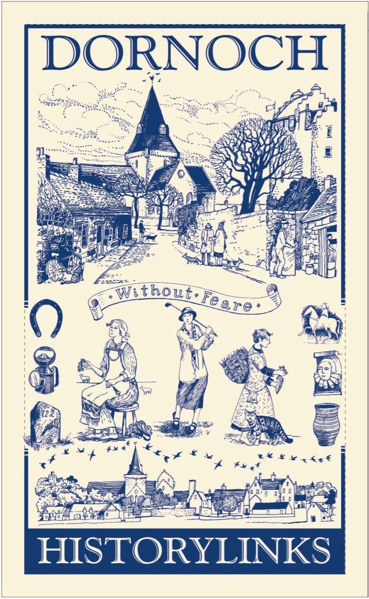 Full size Tea Towel printed with various unique images from Dornoch, complete with gift wrap explaining the scenes.