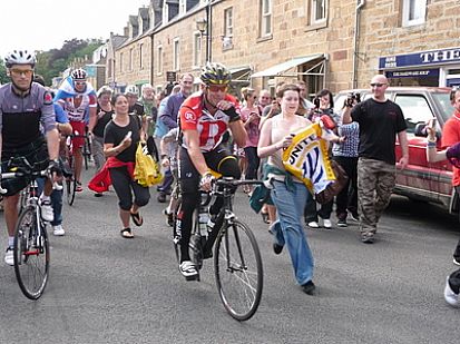 A large following of cyclists, estimated at between 500 - 1,000, and a large crowd of spectators gathered in Castle Street, Dornoch for the event. The ride, blessed with a sunny late afternoon, took a circular route from Dornoch, via the Embo Road to Loch Fleet, then crossed the A9 short of The Mound to take the Loch Buie road to Bonar Bridge, thence returning via Spinningdale and Clashmore.