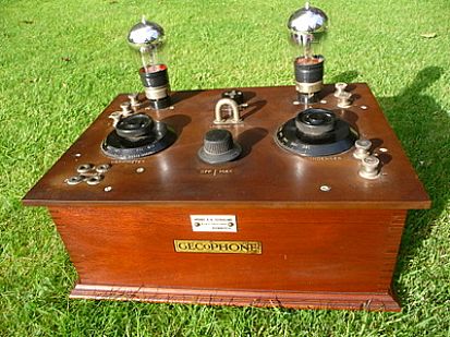 The Gecophone two valve radio was used with headphones and two pairs of sockets can be seen at nearside left of the wooden case..