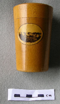 An attractive Mauchline ware glass container has a superb oval image of Dornoch, seen from the north, on one side.