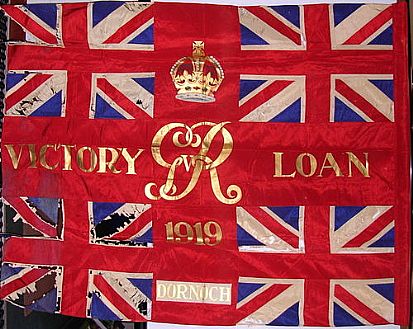 The silk flag has Union Flags in each quarter and a central GvR surmounted by a King's crown, with wording 'Victory Loan 1919' Dornoch'.