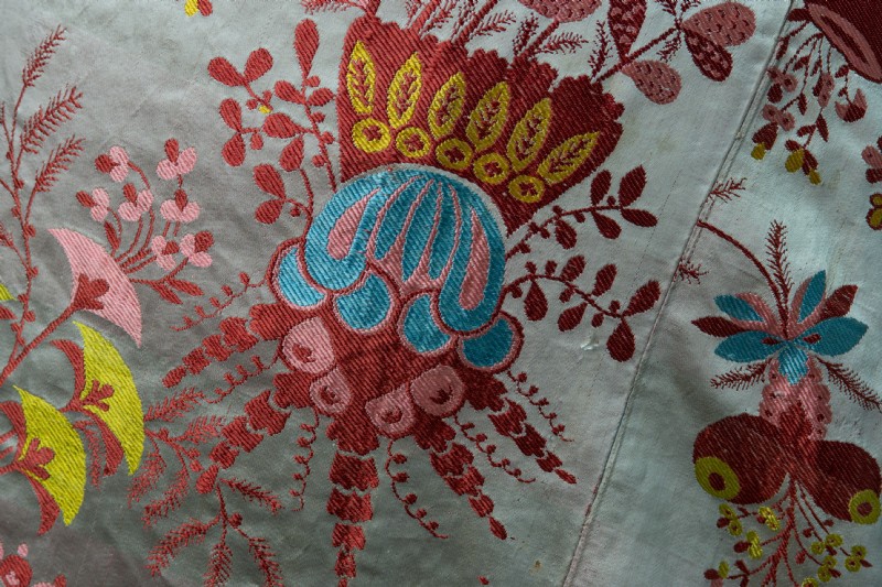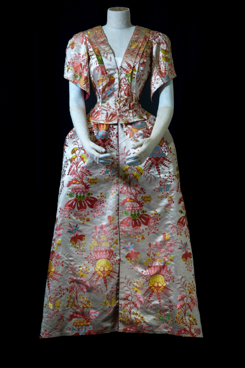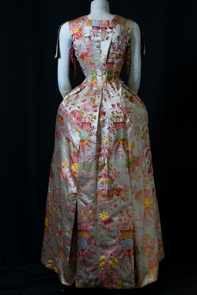 Curator Claire Browne from the V & A Museum in London authenticated the the fabric of the gown as Spitalfields silk  c1710. It was probably designed by James Leman a Huguenot Master weaver in the early 18th Century. The gown has been altered up to 4 times with the last alterations taking place towards the end of the 19th century.
