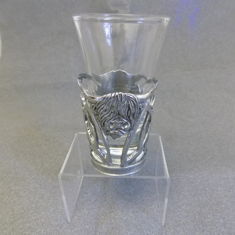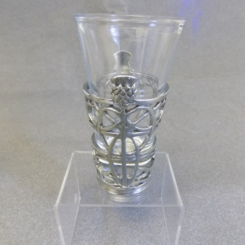 A shot glass nestled in a hand-crafted pewter sleeve with thistle design.