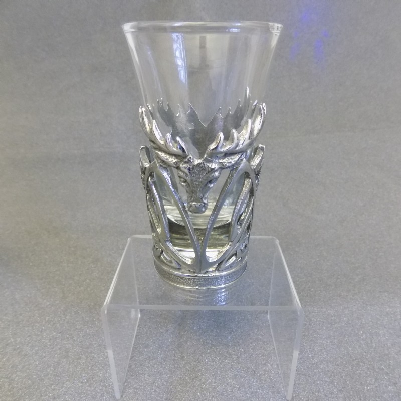 A shot glass nestled in a hand-crafted pewter sleeve with stag design.