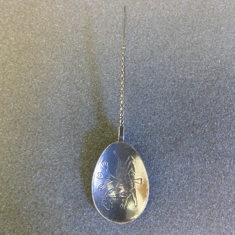 The seal on this reproduction spoon is similar to the coat of arms on a coin struck to commemorate Mary's marriage to Lord Darnley in 1565. The spoon is also decorated with the thistle of Scotland.