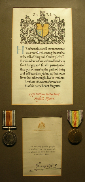 Framed scroll commemorating Lance Corporal William Sutherland, Seaforth Highlanders, who was killed during WW1, with a letter from Buckingham Palace. His medals are mounted beneath the scroll: War Medal and Victory Medal (ribbons faded). Historyliinks Catalogue No. 2004.257