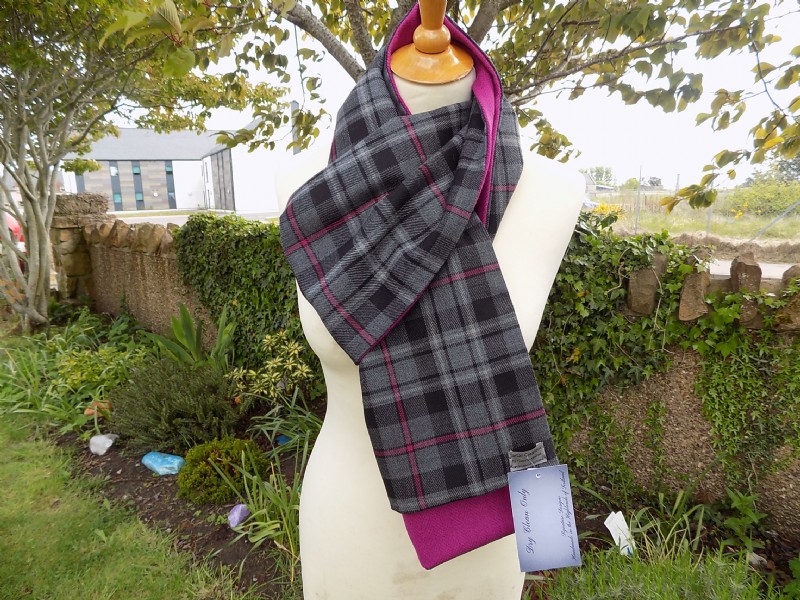 Cosy scarf in Heart of the Highlands tartan with cerise backing.